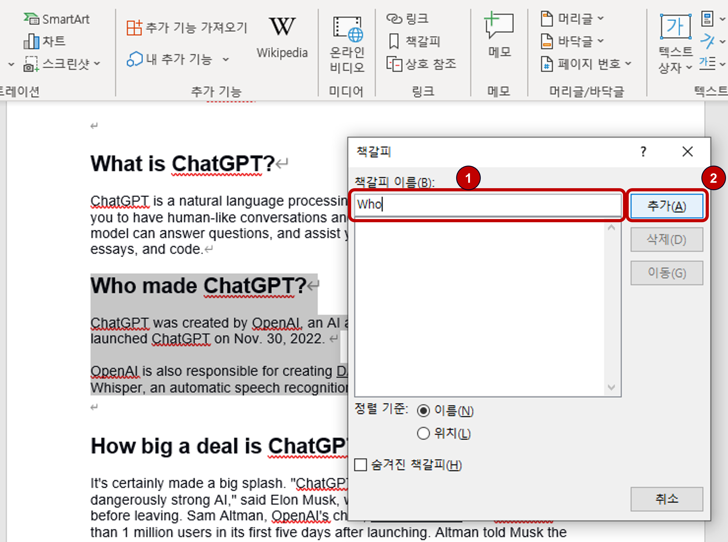 이 책갈피를 클릭해주면 다음과 같이 창 하나가 뜹니다. 책갈피로 내용을 찾기 쉽게 이름을 지정할 수 있습니다.
