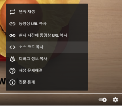 영상을 재생하고 마우스를 영상으로 가져간 뒤 마우스 오른쪽 클릭을 하면, "소스 코드 복사" 라는 옵션이 보일 것입니다.