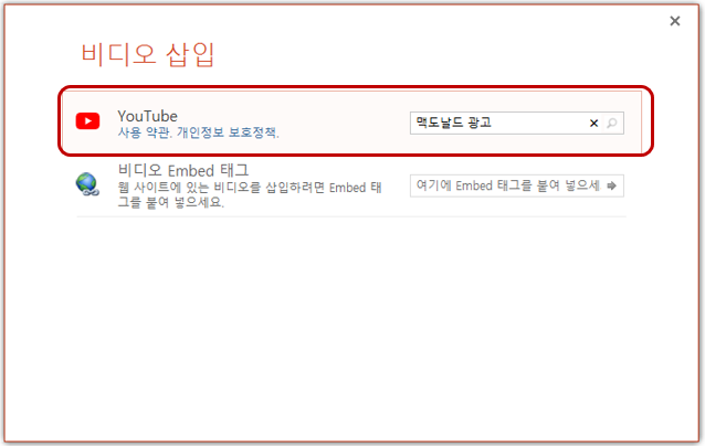 여기서 첫 번째 옵션은 파워포인트 내에서 직접 검색해서 유튜브 영상을 삽입하는 방식입니다.