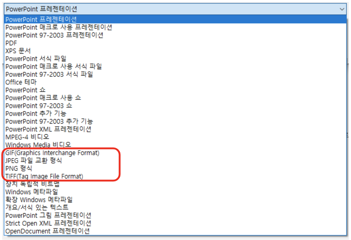 이 드롭다운 메뉴를 클릭하면, 다음과 같이 저장할 수 있는 형식이 주르륵 뜨는데요.