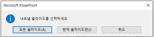 그러면 위와 같이 모든 슬라이드를 선택할 것인지 현재 슬라이드만 이미지로 저장할 것인지 물어보는 창이 뜹니다.