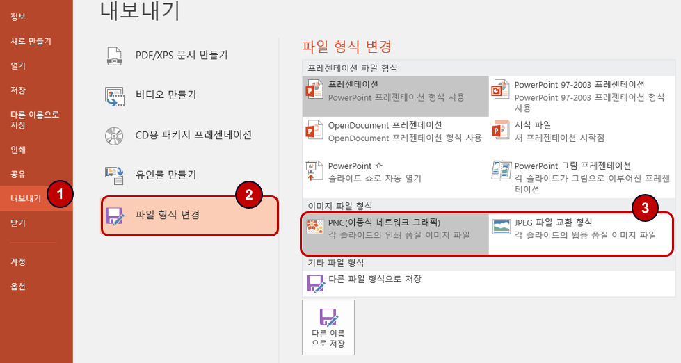 위에서 설명한 방법 외에도 다음과 같은 방식으로 PPT 슬라이드를 JPG 혹은 PNG 형식으로 저장할 수 있습니다.