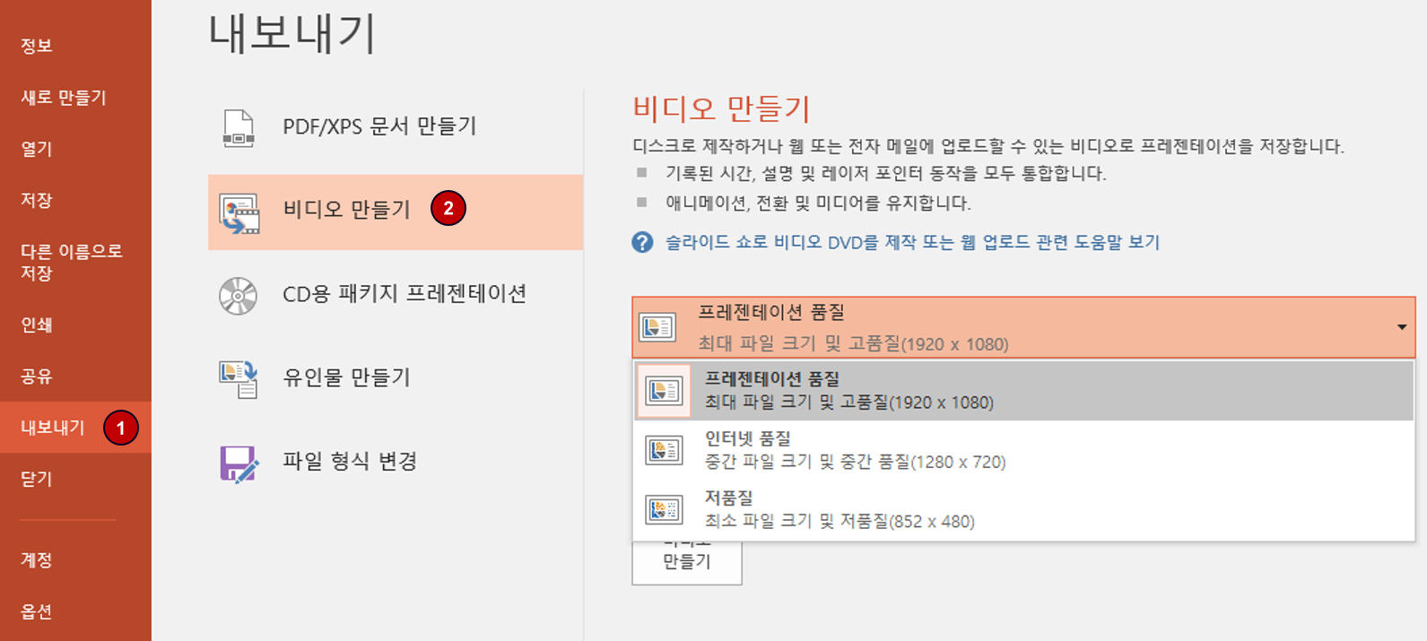 스크린샷의 오른쪽과 같이 "프레젠테이션 품질"을 고르는 드롭다운 메뉴가 있을 것입니다.