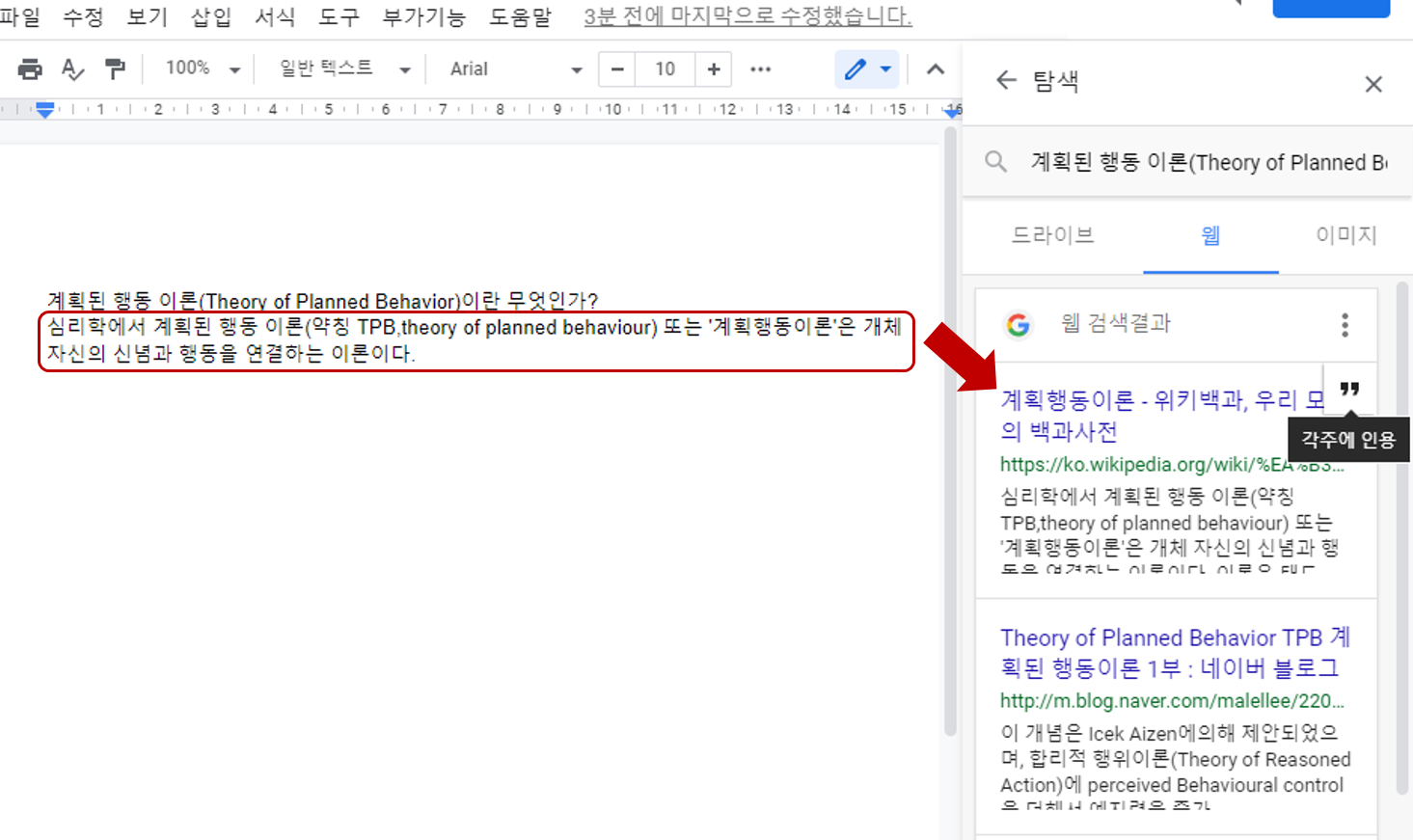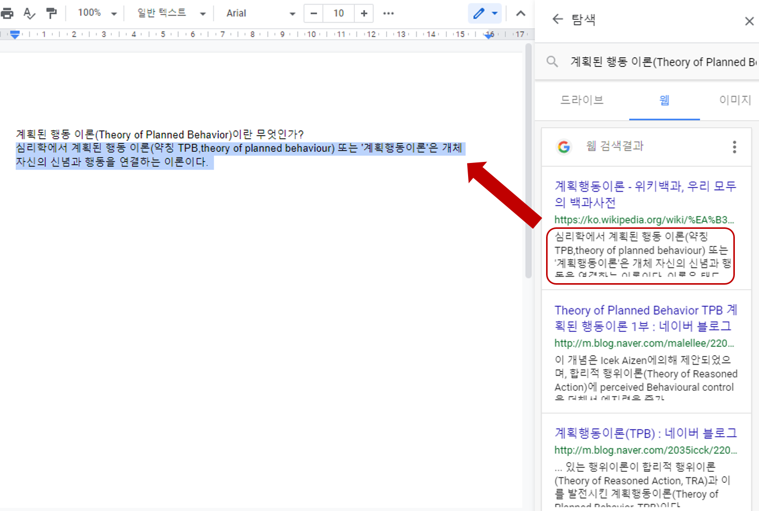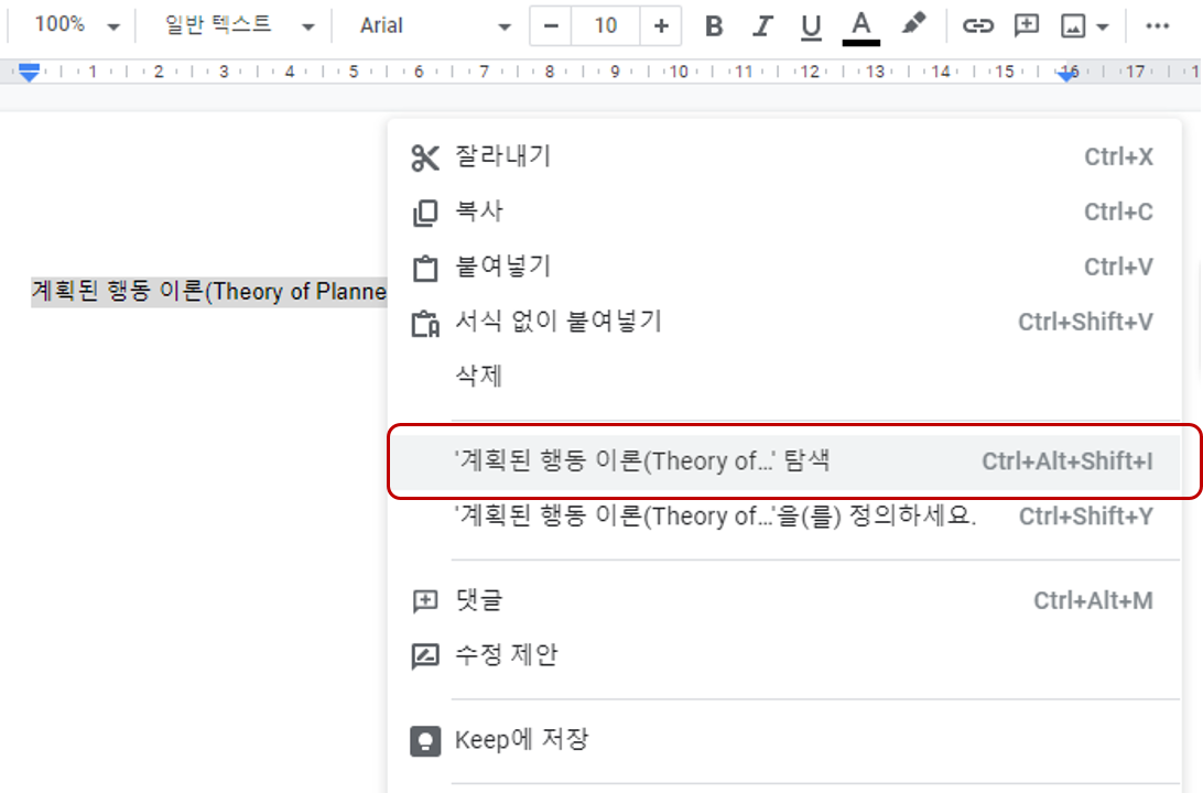 위의 방법들 말고도 이미 문서에 작성한 내용에서 궁금한 부분을 드래그해서 구글 검색 결과를 탐색하는 방법도 있습니다.