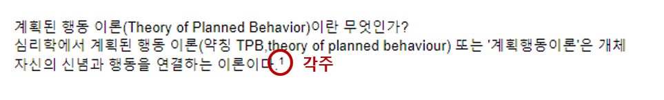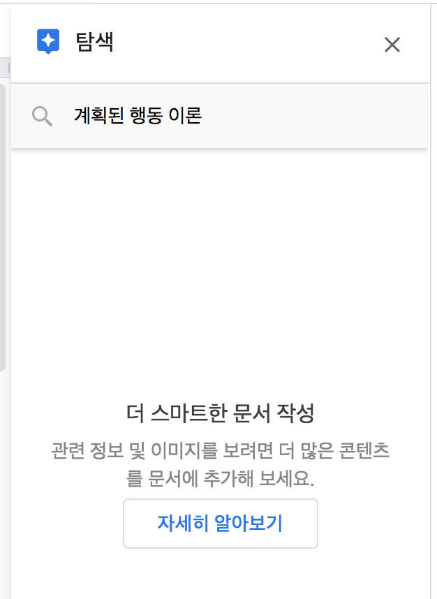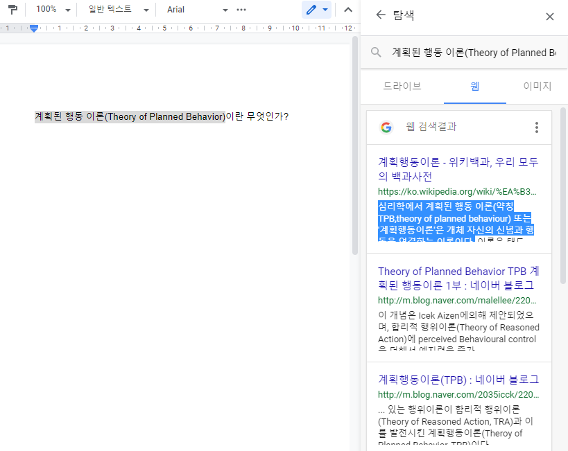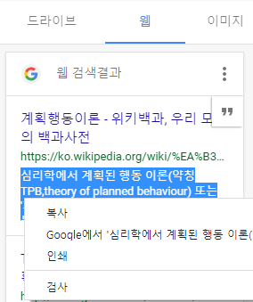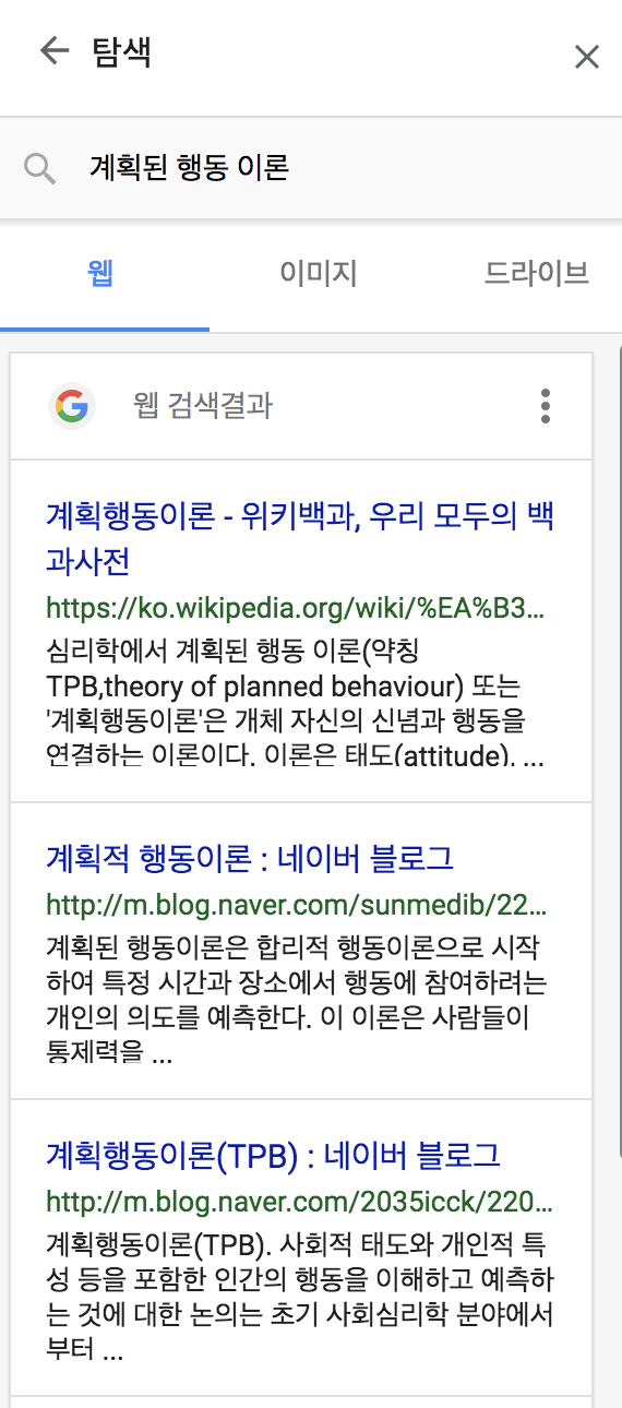 저는 계획된 행동 이론에 대한 자료 조사를 하고 있으므로, 이 키워드를 입력하여 검색했습니다.