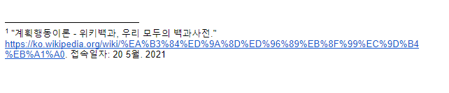 활성화된 각주에 인용 버튼을 누르면 다음과 같이 각주가 자동으로 생성 되며 본문에도 각주 번호가 만들어집니다.