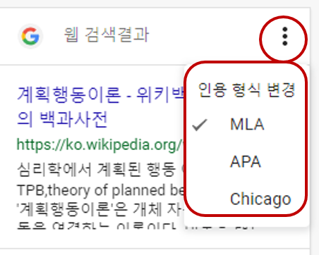 만약 인용 형식을 변경하고자 한다면, 탐색 창의 웹 검색결과에서 점이 세 개 있는 아이콘을 클릭하면 됩니다.