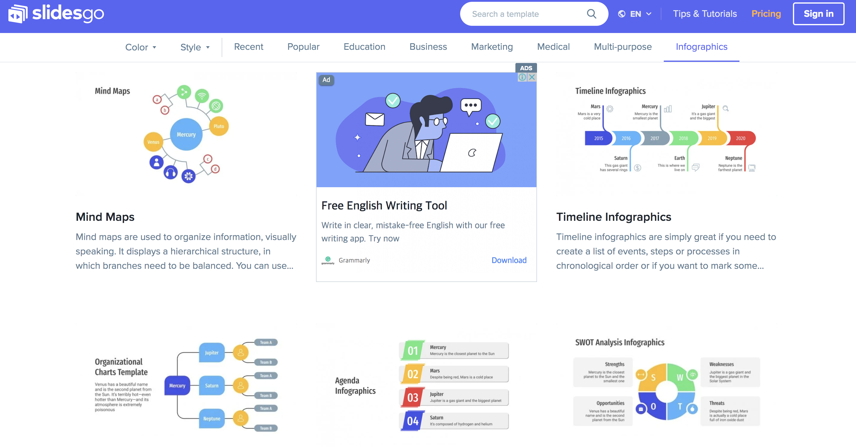 용도에 따라서 비즈니스, 마케팅, 교육, 인포그래픽 등으로 나누었는데, 무료치고는 굉장히 깔끔하고 완성도 높은 템플릿을 다운받을 수 있습니다.